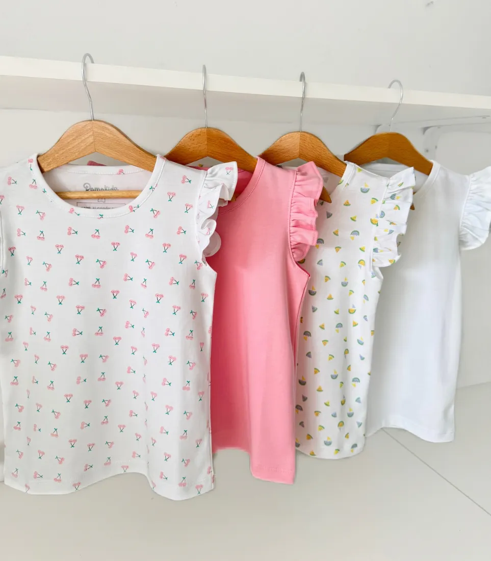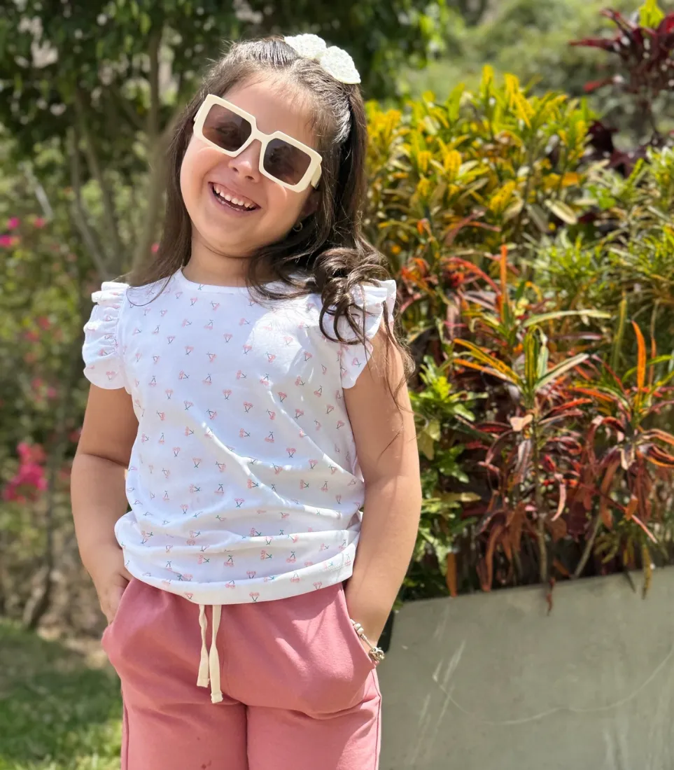 Elaborada en algodón pima, suave y respirable, pensada para cuidar la piel de tu pequeña y acompañarla con total comodidad. Su diseño delicado, con estampado sutil y mangas con volantes, aporta un toque tierno y natural que eleva cualquier outfit infantil.