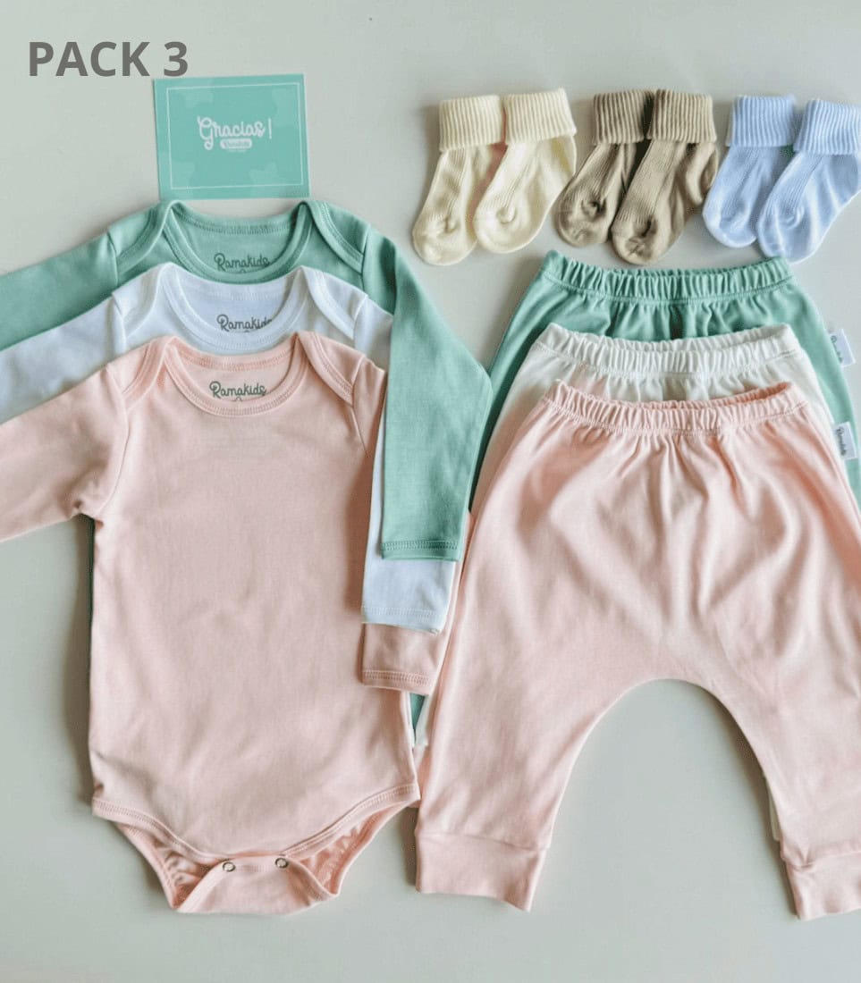 -Pack incluye 3 bodys, 3 pantalones, 3 medias de algodón
