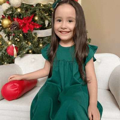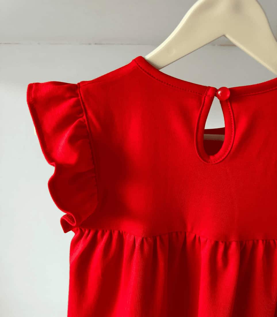 Vestido de navidad elaborado en algodón pima, con delicado recogido en los hombres y detalle de botón en espalda.